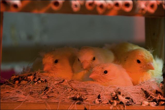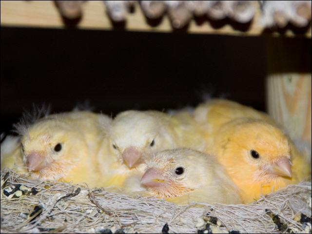 Hier nun die ersten Fotos von unsereren vier neuen Lieblingen. Die sehen doch putzig aus oder? Zuerst dachten wir, das da nur einer im Nest sitzt doch irgendwie haben sich die anderen recht gut versteckt?! Naja, jetzt sind es halt vier und sie wirken alle gesund. Wir haben übrigens beobachtet, daß die vier von unterschiedlichen Kanarien gefüttert werden. |